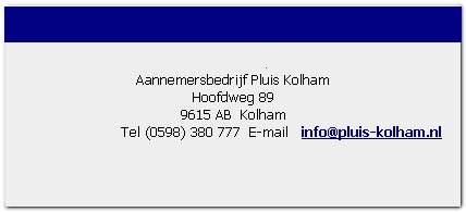 005 | Aannemersbedrijf Pluis Kolham| Hoofdweg 89 | 9615 AB | Kolham | T (0598) 380 777 | E info@pluis-kolham.nl |